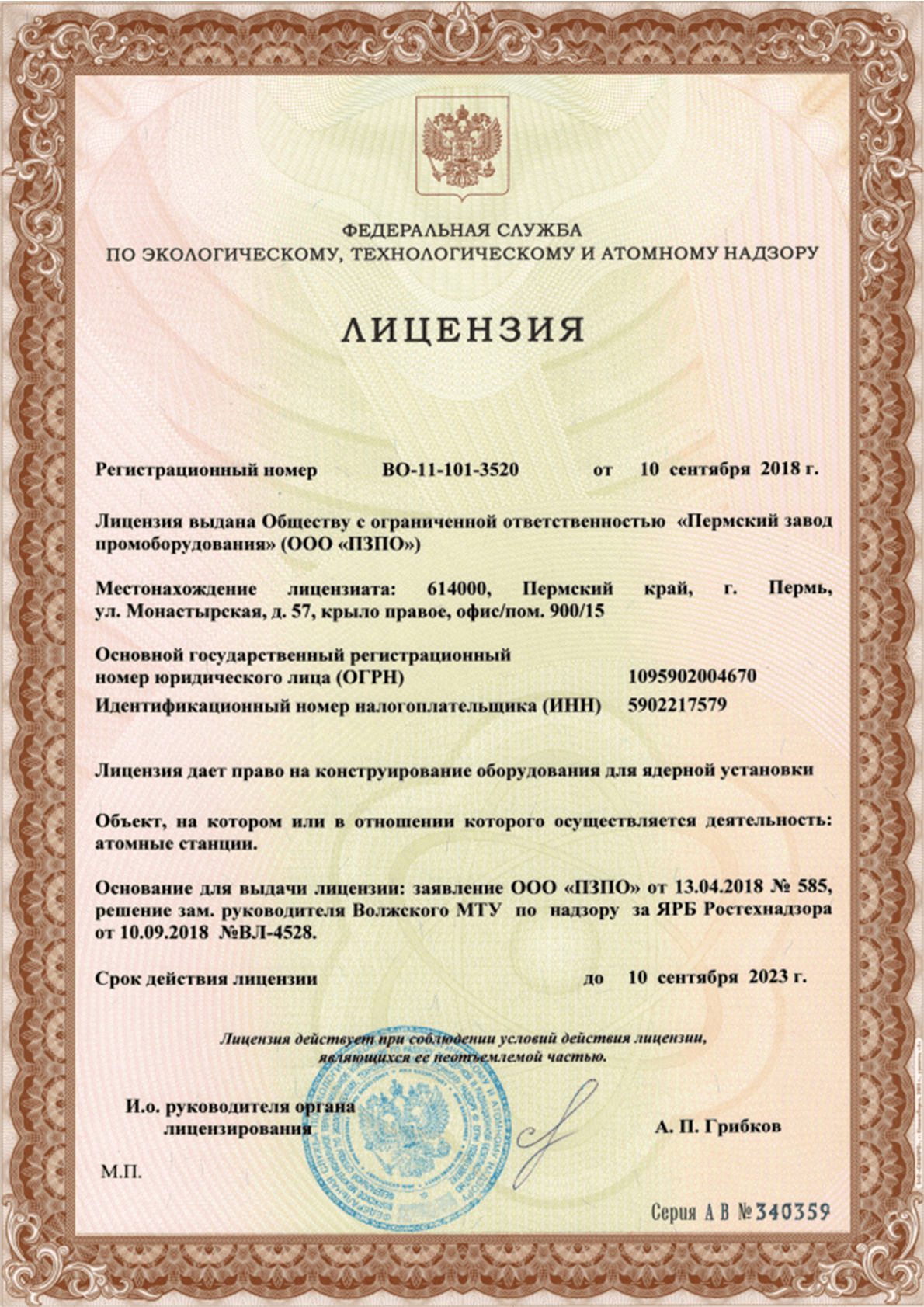 Лицензия на право на конструирование оборудования для ядерной установки