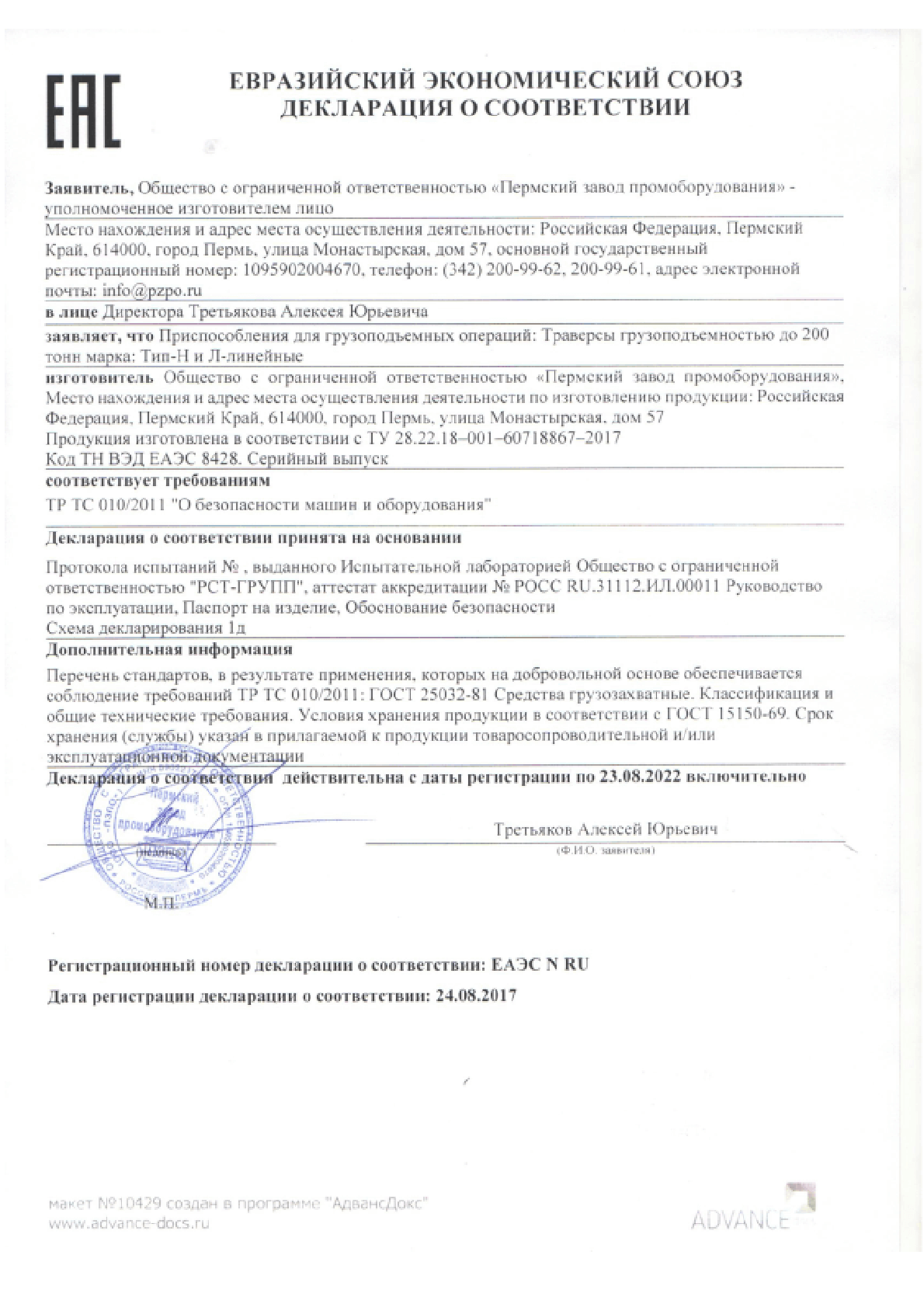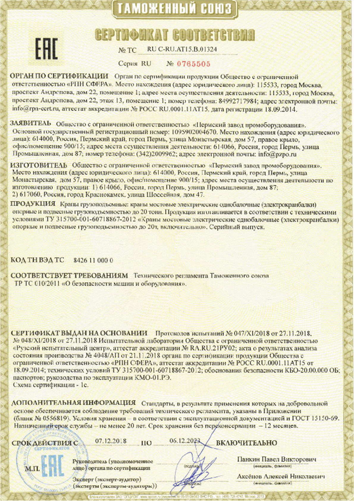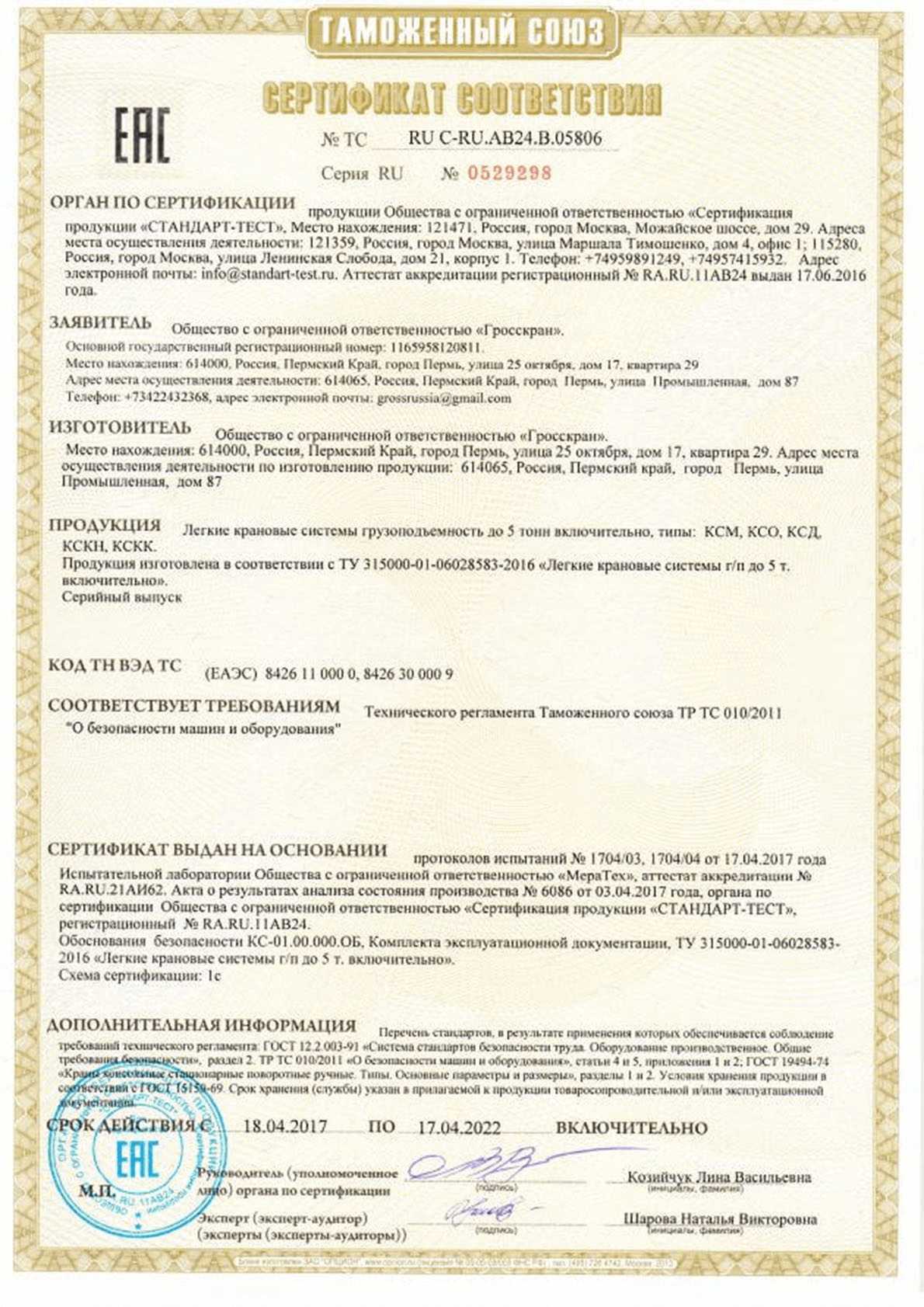 Сертификат ТР ТС - Козловые и полукозловые ручные до 20 тонн