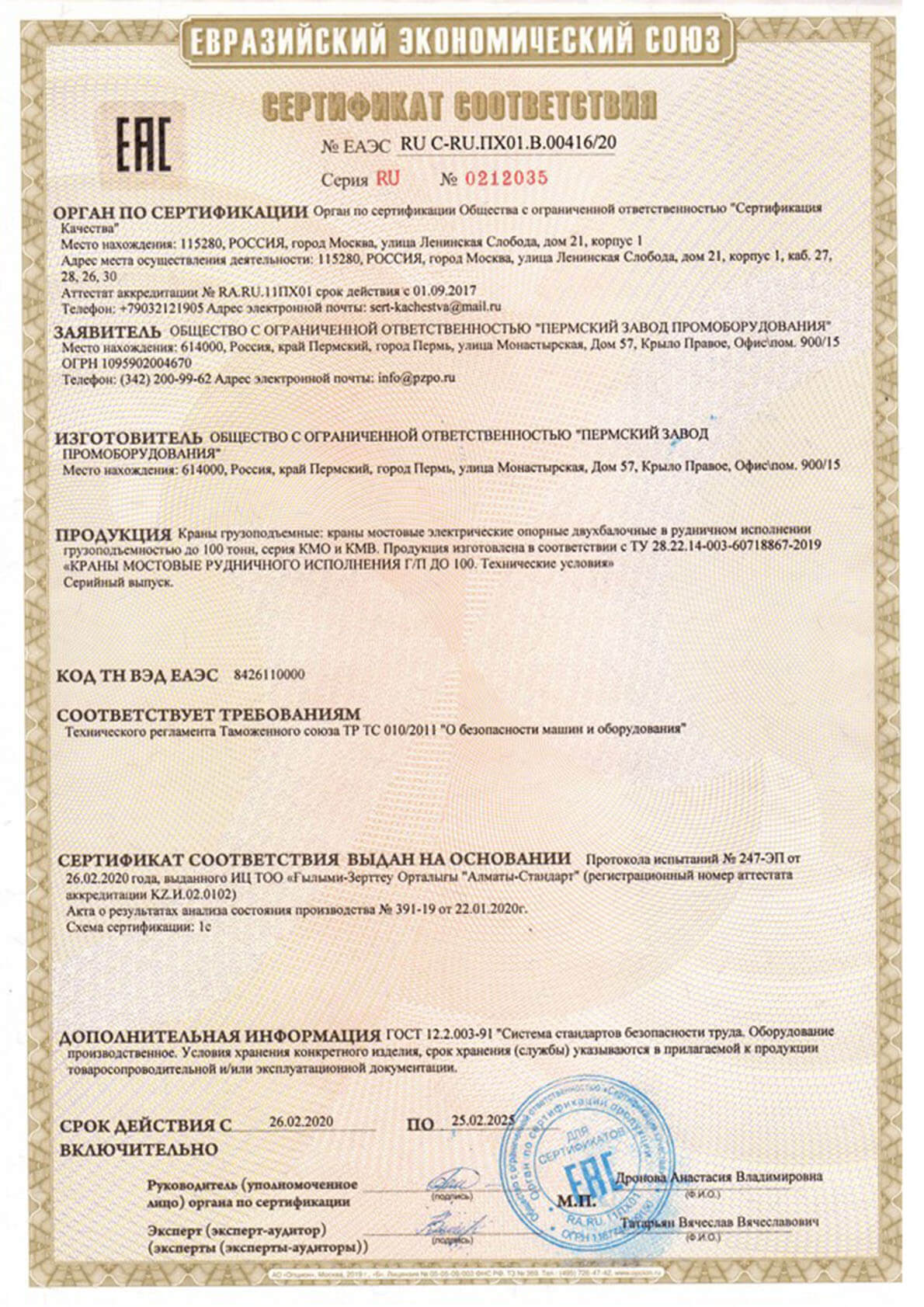 Сертификат сейсмичность 9 баллов двухбалочники 100т