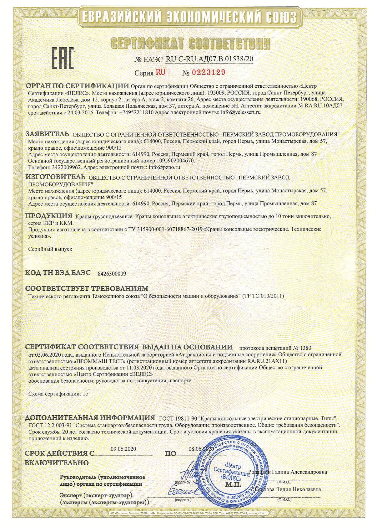 Сертификат ТР ТС Краны консольные электрические передвижные 10 тонн